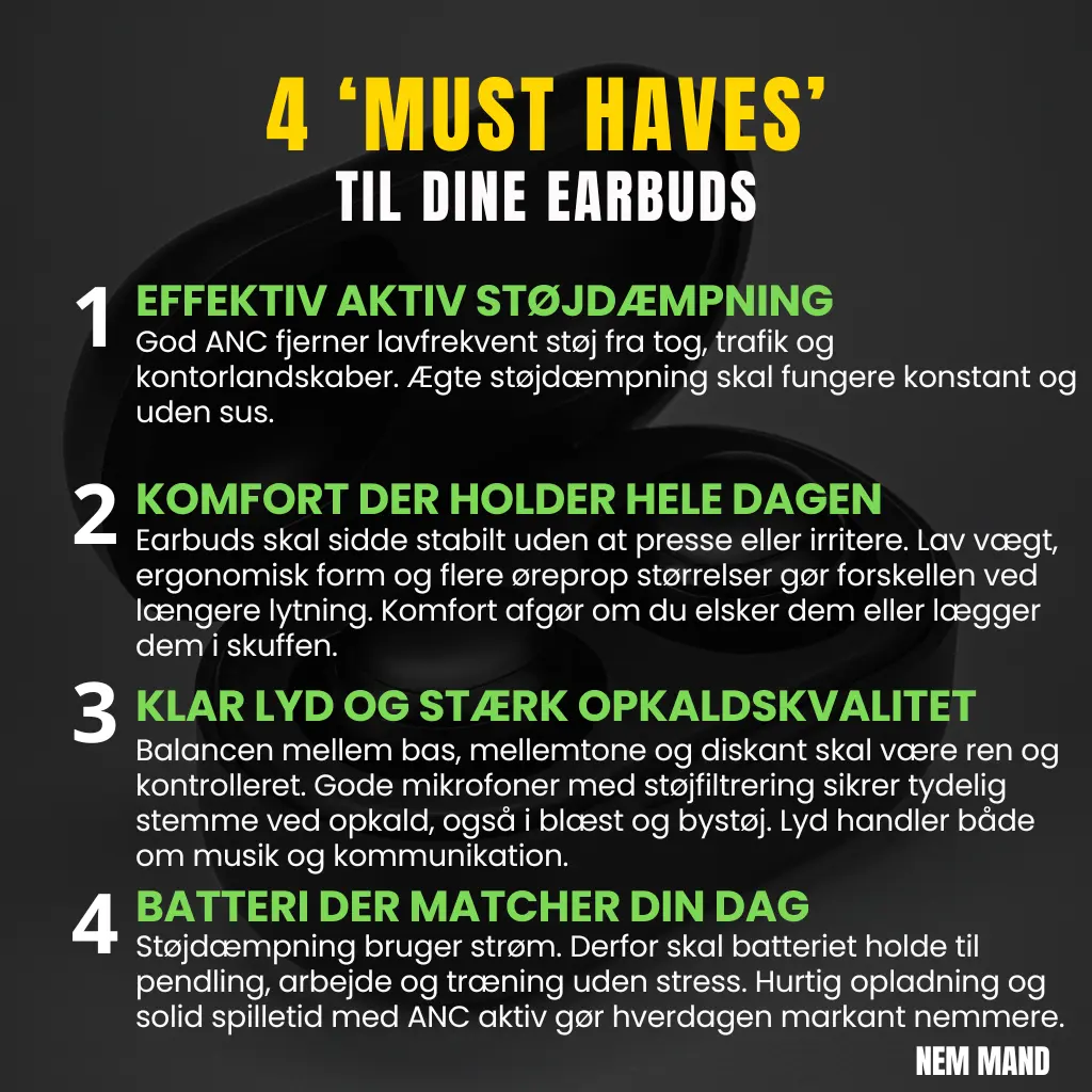Hvis du bruger earbuds udenfor hjemmet, er støjreduktion det valg der giver mest ro i hovedet… Det gør hverdagen nemmere, ikke mere teknisk. For de fleste betyder det færre irritationer, lavere volumen og bedre fokus. Jeg elsker det personligt selv på arbejde, og i offentlige rum mv. Vi håber du har fået alt det info du skal bruge her i guiden til at træffe det bedste valg…