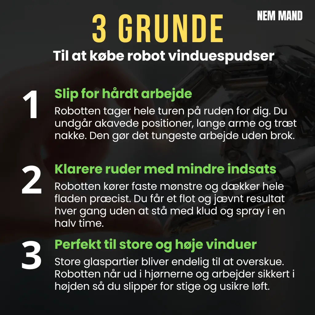 En robot vinduespudser er en genial måde at slippe for alt det man normalt går og udsætter. Ingen store armbevægelser med klud og spray. Ingen halvfarlige positioner op ad vindueskarmen. Maskinen klarer arbejdet, og ruderne ender pæne uden stress. Det giver mere overskud og en langt mere behagelig måde at holde hjemmet skarpt på.