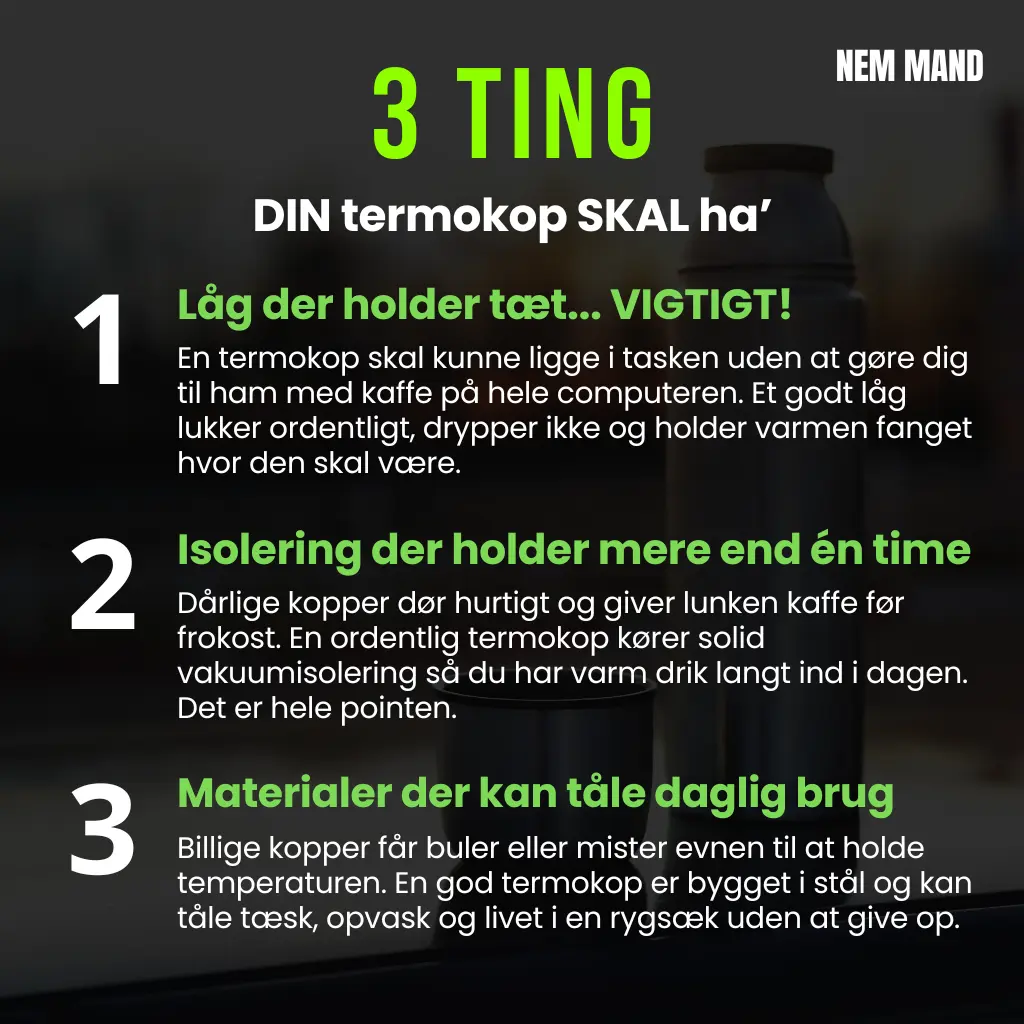 Vores valg af de bedste termokopper handler om funktion i virkeligheden. En god termokop redder morgenen, når du er på vej ud ad døren med kaffetørst og lav tålmodighed. Den holder drikken varm i flere timer, passer i kopholderen og kan smides i tasken uden stresse over, at miste sin kaffetrang…